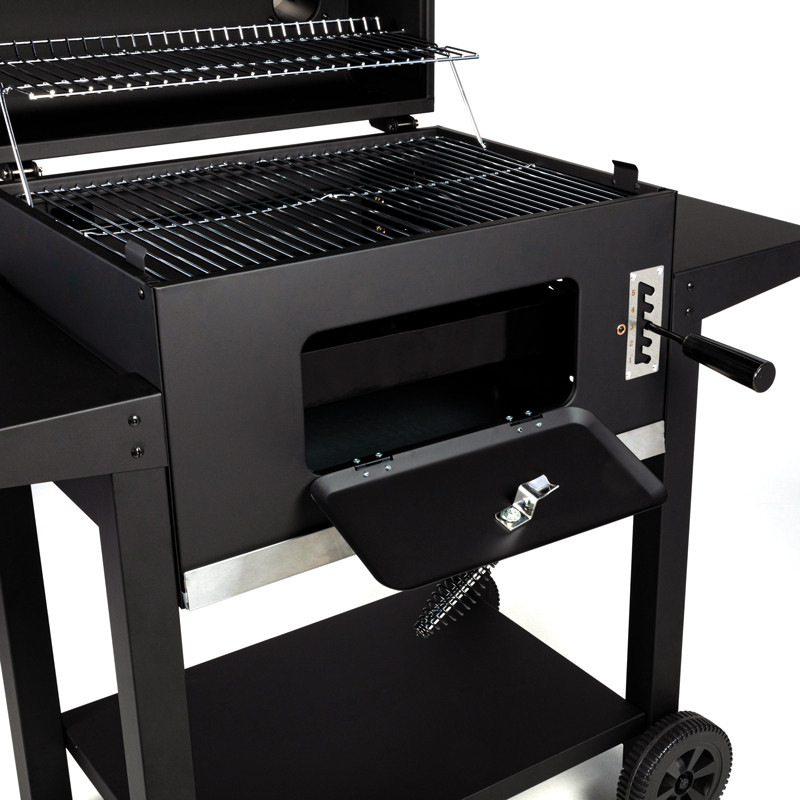 Barbecue à charbon, châssis en acier avec cuve foyère en acier émaillé réglable par système de crémaillère, couvercle de cuisson, grilles en acier chromé , sur chariot.